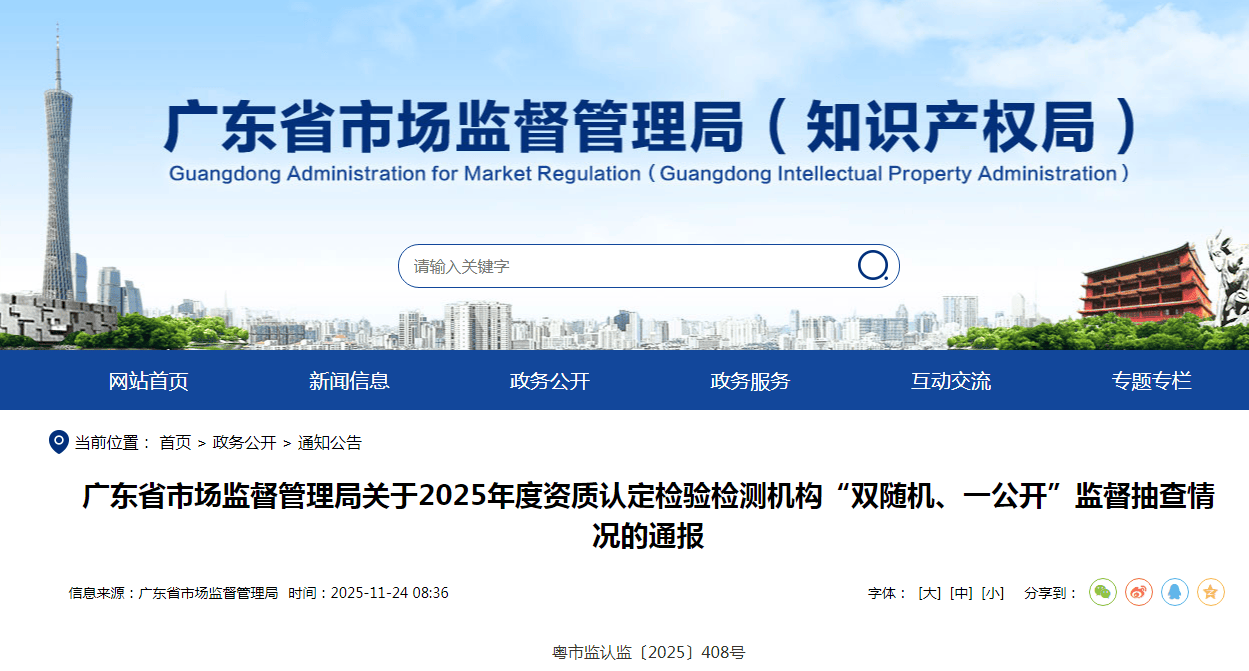 中国质量旧事网讯 据广东省市场监视办理局网坐动静,近日,广东省市场监视办理局传递2025年度天分认定查验检测机构“双随机、一公开”监视抽查环境。